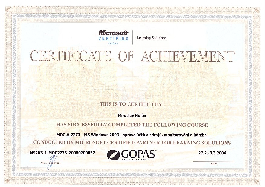 | 2006 | Microsoft Windows 2003 server, správa účtů a zdrojů, monitorování a údržba certifikát |