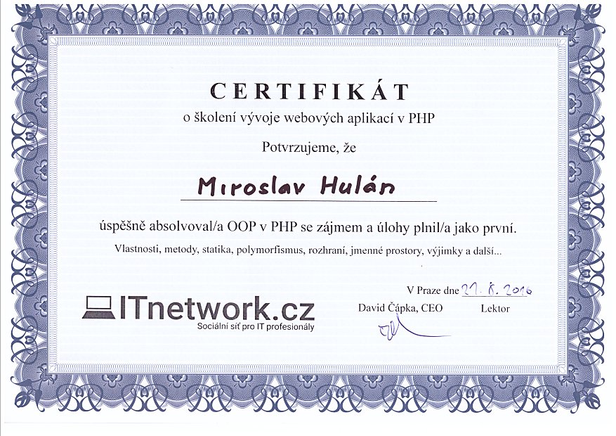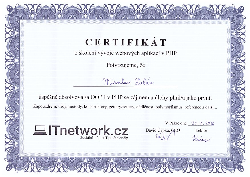 | 2016 | ITnetwork - Vývoj webových aplikací OOP v PHP: certifikát 1, certifikát 2 |
